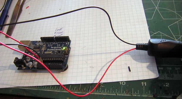 Si estás deseando para probarlo, adelante y conecte el cable rojo a la cabecera de 5v y el cable negro en la cabecera de la tierra en su Arduino. Se debe encender y empezar a ejecutar cualquier código es en su flash.