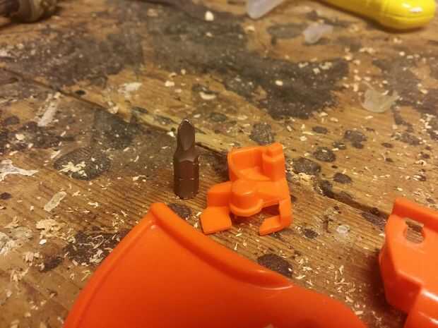 2) eliminar cualquier sujetadores que sujetan las dos mitades. Mi pistola de pegamento caliente tenía tornillos de cabeza Phillips junto con un tornillo de seguridad de accionamiento triangular. Mi seguridad dandy handy bits set de ye olde puerto carga tenía varios pedacitos de unidad triangular de diverso tamaño. Tornillos triangular no parecen querer utilizar más de un par de veces, así que aplicar una buena cantidad de presión hacia abajo para que la broca de deslizamiento y pelar hacia fuera en su primer camino.