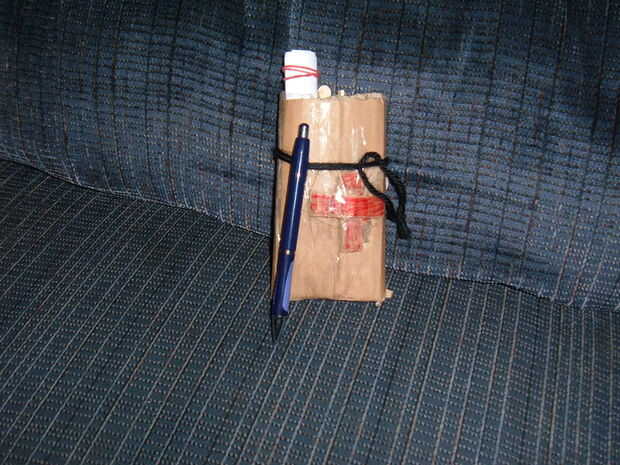 ahora doblar la cartulina en un cuadrado y cinta adhesiva. ahora si quieres, toma un cartón y pedazos pequeños de él. luego con cinta adhesiva dirigentes para hacer una cruz, ahora color rojo. luego péguela en el kit. o se puede obtener 2 bandades y hacer una cruz. es su opción. ahora a los primeros auxilios. tomar la cuerda y atarla en el kit y clip de la pluma que. Ahora toma las 2 hojas de papel y rollo de los dirigentes. ahora sus rubberbands en el paper.now tomar todo y ponerlo en su de alguna manera. Ahora ya tienes tu kit de primeros auxilios en.