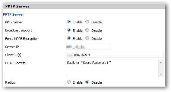 - CHAP-Secrets: Nombre de usuario y contraseñas para la autenticación de la VPN. El formato es "usuario * contraseña *" (user[space]*[space]password[space]*), con cada entrada en su propia línea. En nuestro ejemplo, hay sólo un solo aceptado nombre de usuario (jfaulkner) y contraseña (SecretPassword1).