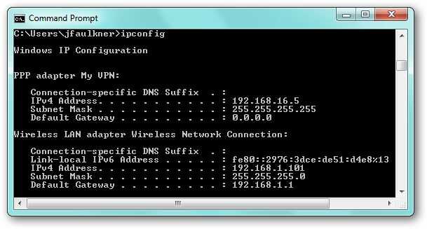 Ejecuta 'ipconfig' en el equipo local debe mostrar que está conectado a la VPN y la conexión a internet existente.