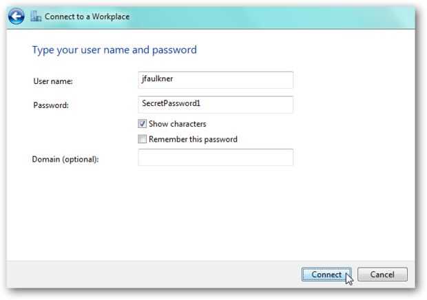 Introduzca las credenciales para el inicio de sesión VPN que se configuró en el DD-WRT configuración del enrutador. Haga clic en conectar.