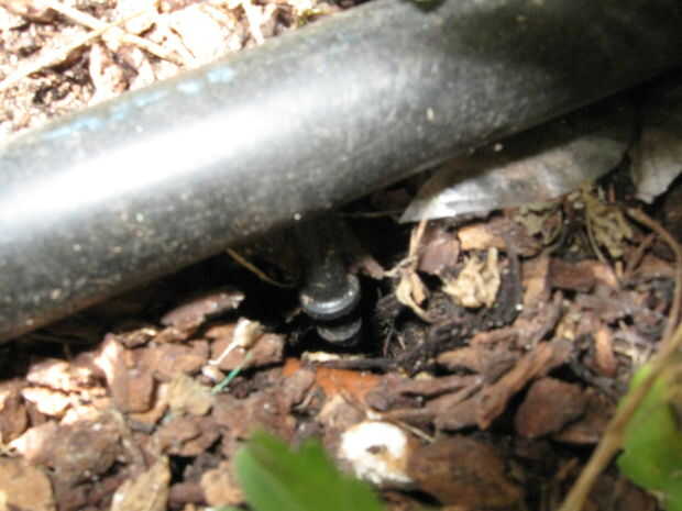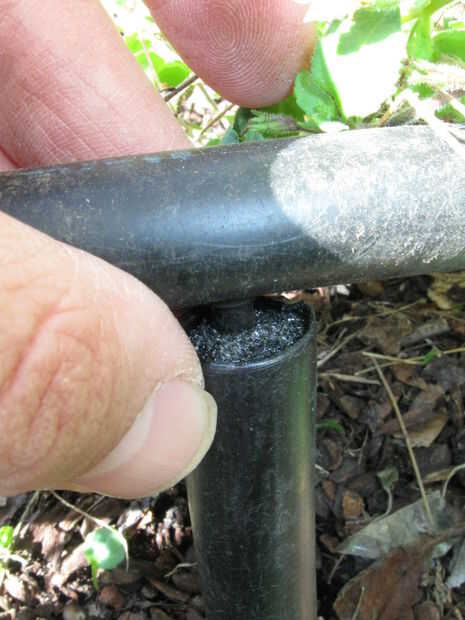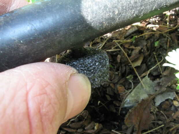 Así, mi segunda versión va como sigue (ver fotos 2-5 abajo): insertar la lengüeta x lengüeta de la manguera apuntando hacia abajo, luego envuelvo la sección central de la lengüeta x lengüeta con burletes de espuma adhesiva. Luego usar una clavija de madera para Hágale un agujero en el suelo justo debajo del emisor de la lengüeta. Tome una 3" longitud de tuberia de riego, ajuste cómodamente sobre el burlete e Inserte el tubo en el agujero en la tierra. Así, el emisor de la lengüeta tiene un espacio vacío debajo de él que se mantiene abierto por la tubería. He tenido algunas de estas en el lugar desde el otoño pasado y pronto lo reviso para ver si todavía están trabajando. En general, creo que la segunda versión es una mejor idea, pero hay algo muy gratificante ver el agua squirting de los emisores de la lengüeta sobre el suelo.