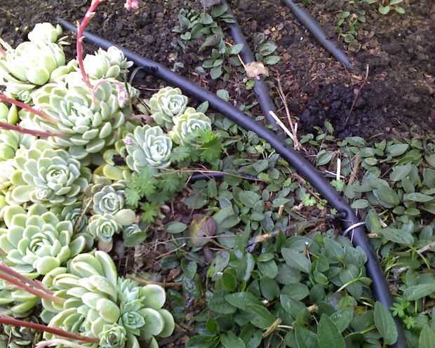Un problema que tengo es que no sé que las plantas reciben más agua y cual menos. Con emisores que apuntan directamente hacia fuera o hacia arriba, sería posible medir el caudal, pero que sería más difícil con los apuntando hacia abajo. Supongo que simplemente tendré que mantener una estrecha vigilancia sobre las plantas y agregar emisores más a plantas que parecen necesitar más agua.