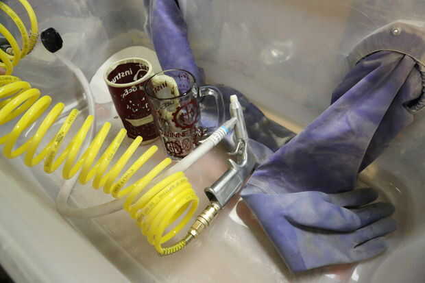 Simplemente rociar el vidrio por un minuto o dos, como si estuvieran pintando. La arena rápidamente rayará el vidrio mientras el vinilo protegerá las piezas que desea permanecer claro.