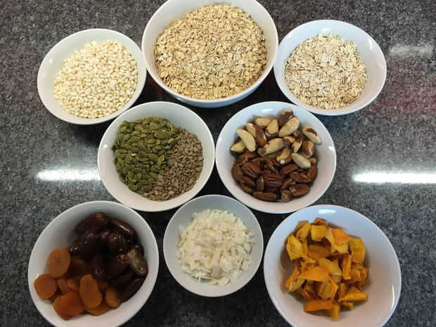 Puede utilizar cualquier cosa que te gusta en tu muesli mientras se seca. Tostar los cereales, nueces y semillas mejora el sabor. Una vez intenté copos de mijo, pero nunca otra vez - sólo son adecuados para los periquitos!