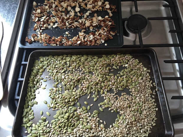 Tueste las nueces y las semillas de una manera similar.