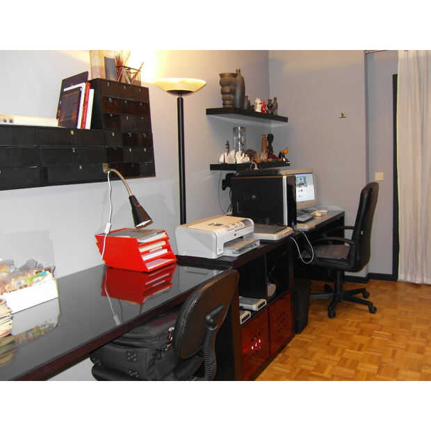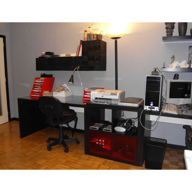 Sin embargo, las etiquetas son en Portugués. Lo siento. Pero la oficina es básicamente un montón de estantes y dos tablas. Supuesto no terminó allí, pero prefiero comprar las cosas poco a poco para probarlos fuera antes de comprar un montón más. De esa manera podrás saber realmente lo que vas a necesitar.