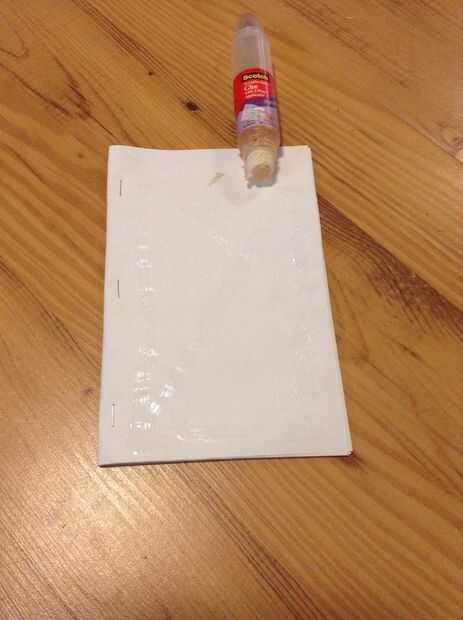 Encolar el frente y la parte posterior de la impresora con papel. Colocarla dentro de su papel de construcción. El interior de las cubiertas delanteras y traseras, debería verse como la segunda foto.