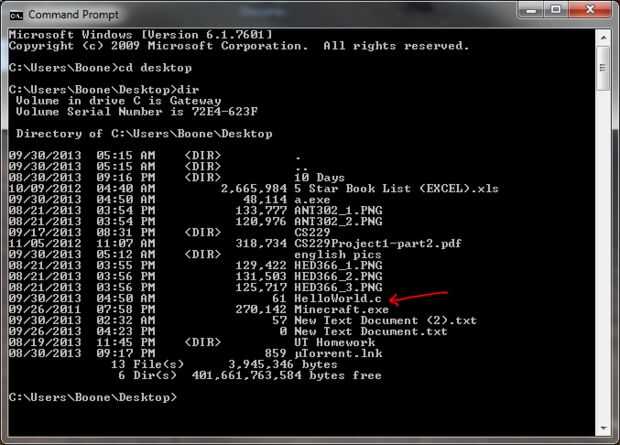 dir está parado para "directorio". En la ventana de comandos tendrás algo que parece "C:\Users\Boone" que es el "directorio de trabajo". Escribir dir y pulsar entran voluntad lista todos los archivos que se encuentran en el directorio de trabajo. Lo que nos lleva al siguiente comando cd, que está parado para "cambiar directorio". Escribir cd desktop y presionando entran voluntad llevará a donde se guarda el archivo "HelloWorld.c" (si lo guardaste en el escritorio como yo). Puede verificar si se está escribiendo dir.