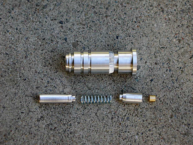 El resorte va en el mismo agujero, y lo que retiene y mantiene bajo compresión es un tapón de aluminio en la base del agujero. Para hacer el proceso de prensar el enchufe en un la prensa de husillo un poco menos de miedo hice mis primeros con un hombro en el enchufe también. He dejado de hacerlo desde y vuelto a trazar los planes para reflejar esa elección.