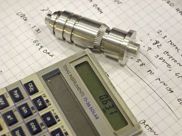 Afortunadamente el aluminio es, otra vez, perdón. La pieza puede ser hasta. 0015" grande y aún pueden ser aplastados en su lugar más o menos por la prensa de husillo. El truco aquí es el diseño por lo que la primavera está ya bajo un poco de compresión. Puesto que la primavera es 1,125" de largo, y el recorrido del botón requerido es sólo.240, tenemos un buen. 2" de jugar en cómo profundo los asientos del enchufe. Como las piezas son diseñadas, el resorte se comprime a. 9" ya. Esto significa que si el enchufe se atasca por. 1" la primavera seguirá siendo bajo compresión y el botón todavía va a quedar fuera ya diseñado.