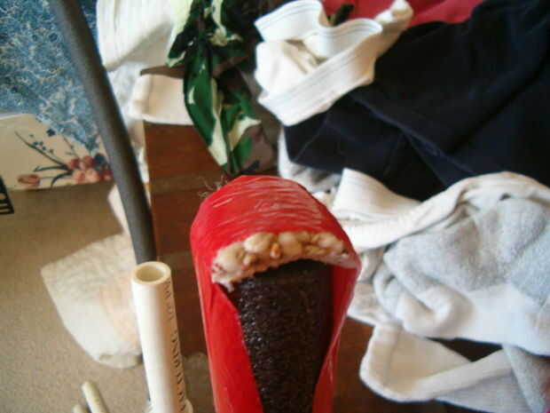 Sacar la alfombra y cortarlo en cuadrados de aproximadamente 1 por 1 o sólo lo suficientemente grande como para cubrir la espiga con las esquinas sobresaliendo sobre el lado. Entonces conducto cinta adhesiva hacia abajo tan firmemente como sea posible, como se muestra a continuación.