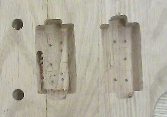 Mida la altura de tus pastillas. Debe ser de 3/4" o algo así. Puesto que sobresalgan de la superficie de madera, podemos perforar los agujeros a esa profundidad y todavía tienes espacio para cableado. Ponga un 3/4" forstner broca en el taladro y perforar una serie de agujeros alrededor del perímetro de cada bolsillo. Dejar los dos bits en el lado para el molino. La mayoría de los materiales debe ser removida. Repita con la otra pastilla.