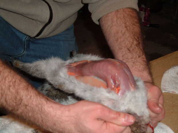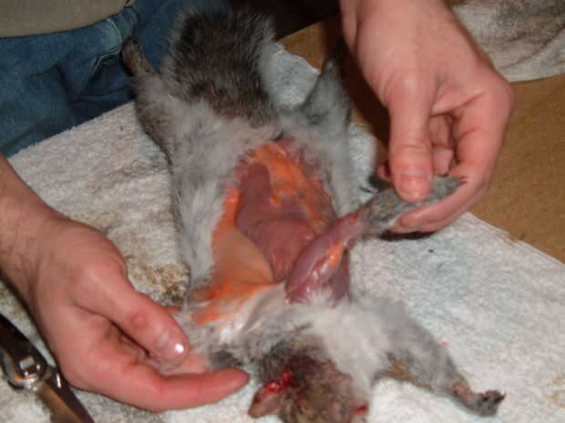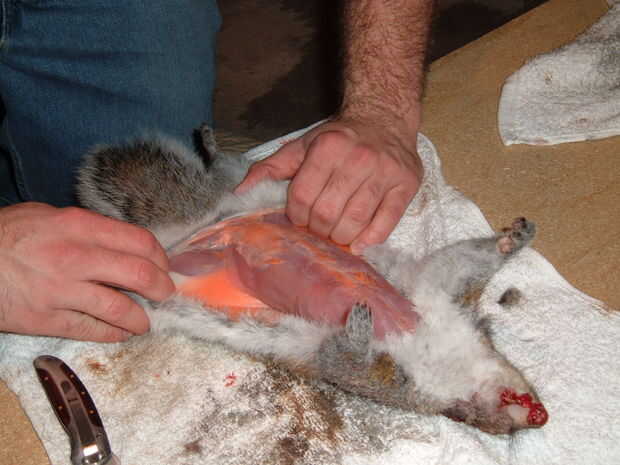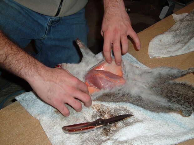 Al llegar a las piernas tienes que cortar la piel desde el centro del cuerpo hacia fuera, hacia los pies. Ayuda si usted hace un corte circular alrededor de la muñeca/tobillo.