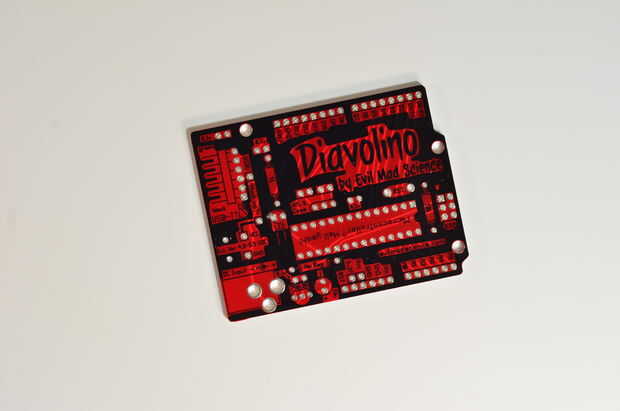 - van de kit de Diavolino uiteraard de Evil Mad Scientist: bestaande uit het PCB, ATMEGA 328P (ic) de la viruta en de losse componenten + beschrijving van de Diavolino