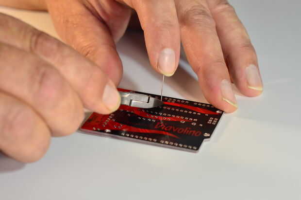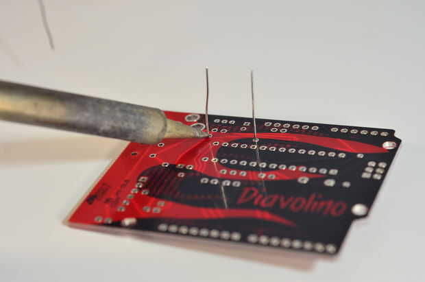 Draai nu het PCB om zodat de pootjes van de weerstand naar boven steken. Pak de soldeerbout en raak zowel het soldeerpunt als het pootje van de weerstand. Houd dit 1 seconde vasta.