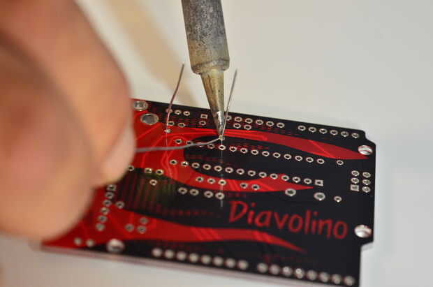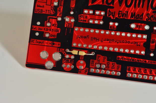 Vanaf nu heb je de Diavolino handleiding la puja (bijlage). Hierop staan alle Diavolino piezas uitgelegd. Pak nu en het PCB plaats de weerstand en de daarvoor bedoelde gaatjes.