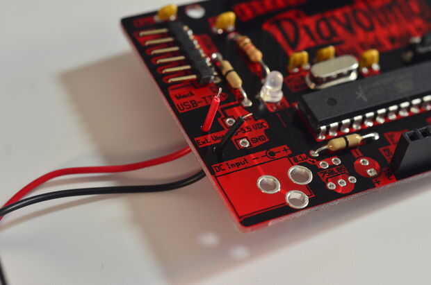 De rode draad está además en de zwarte draad es tierra/aarde. DIT staat aangegeven op je Diavolino. Soldeer beide draden vervolgens en het tweede gaatje vasta.