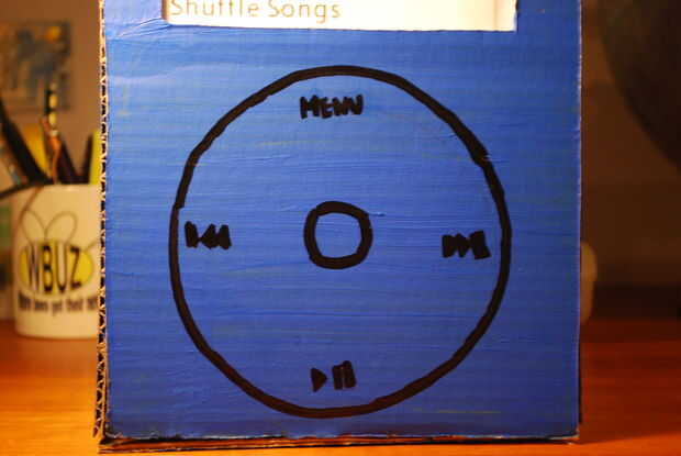 Después de haber pintado las piezas azul, él toma frontal y dibuje un círculo sobre ella. En el centro del círculo que acaba de trazar, dibujar un círculo más pequeño. En la parte superior, escriba menú. A la derecha, dibujar las flechas de derecha y un bar. En el lado izquierdo, dibujar triángulos frente de izquierda y un bar. En el fondo, dibujar un triángulo de la derecha y dos bares.