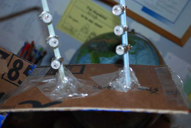 Ahora usando la paja con las luces encendidas, con cinta adhesiva a la pieza superior de la cartulina. Puede hacerlo doblando la cinta de embalaje por lo que es la paja y el cartón.