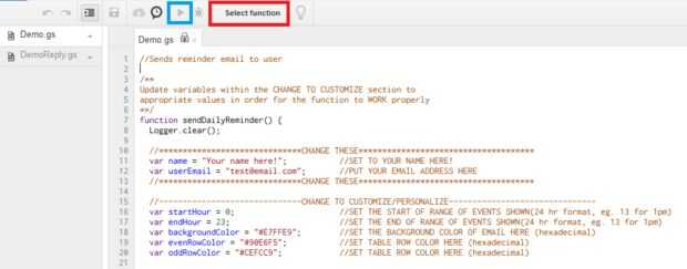 - Ir a la "función de seleccionar" desplegable en la parte superior del editor de script (resaltado en rojo)