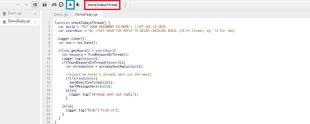Ahora, tenemos que asegúrese de que el script "DemoReply.gs" funciona correctamente.