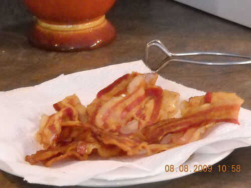 El método de "placa y papel toalla" sólo funciona para un muy pocas piezas ya que saturación las toallas de papel y terminas en efecto freír el tocino en su propia grasa, que aparece y hace un lío en el microondas. También encontré que las toallas de papel Haz pegadas al tocino mal que te puedes, por lo que mezcle la parte afectada o come el papel.
