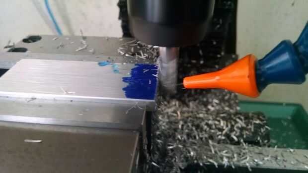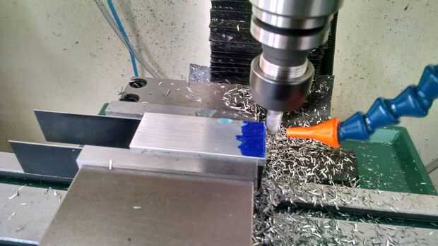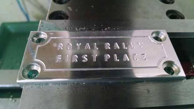 Después de que la base tenía el bolsillo molido y el ajuste es aceptable, es tiempo de crear el cartel. Primero medí el ancho de la base, y usando un marcador Sharpie como líquido de diseño, describen un rayado para el ancho de la placa. Entonces consiguió a recorte abajo el cartel. Después de que el cartel fue reducido, pasó algún tiempo en SprutCAM creando una trayectoria de herramienta simple para perforar las esquinas, luego avellane, graba un borde perimetral y finalmente el texto.