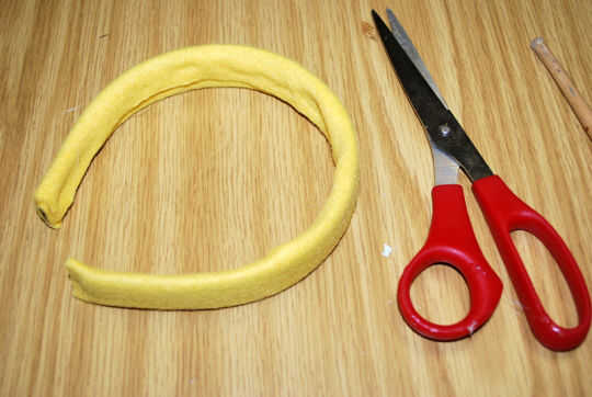 Línea de su sentido a lo largo de un lado de la diadema, manteniéndolo centrado. Agregar el pegamento caliente en el interior de la diadema y adjunta el fieltro en el interior. Continuar con el proceso para la venda entera.