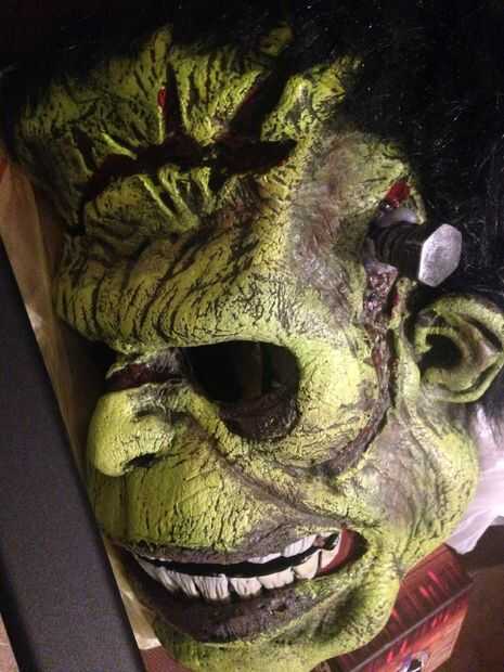 Tenemos una máscara usada de eBay y volver a pintar con una esponja y alguna pintura acrílica para ver un poco más "viva", que agregué los pernos (madera corchos) porque sólo tenía una, yo caliente pegado donde los originales un día estuvo.