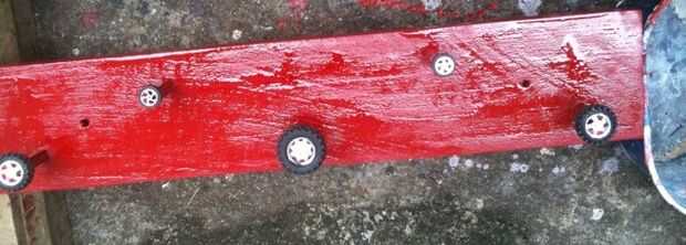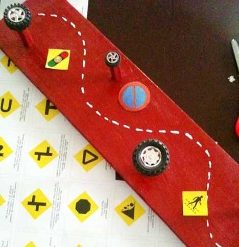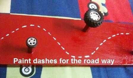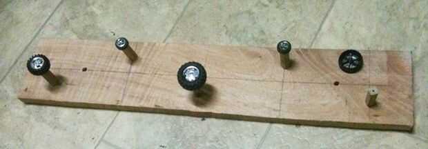 Tomar un taco y corte a 1,5".. .drill un agujero en un lado para el clavo de tornillo y otro otros para encajar el eje del coche.