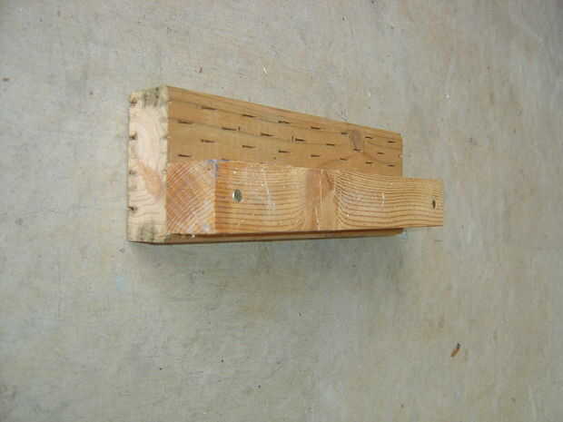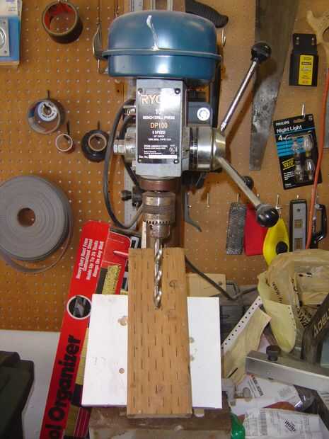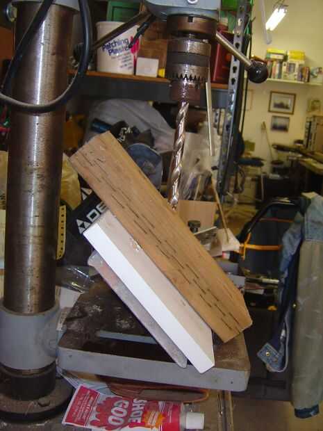 6. colocar la cuña bajo el taladro con la guía de 'V' en la parte superior y perfore a través de la articulación donde se unen las tablas (por el medio de la 'V').
