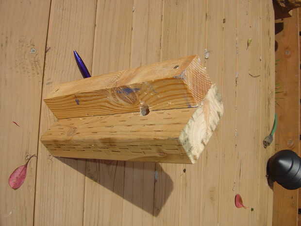 3. Coloque la cuña en el taladro con sus piezas de 2 x 4 en la parte superior y perfore un orificio de 1/2" totalmente a través de la Junta como se muestra.