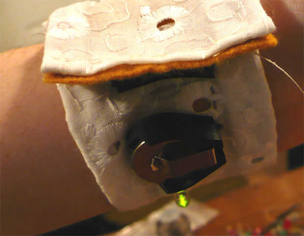 Aquí es un proyecto de circuito de suave rápido y relativamente fácil que dirigió un taller abril de 2007. Divertirse un poco con hilo conductor y circuitos 'coser' y hacer un fresco pilas LED del pun ¢ o usar fuera de casa. Sólo se alimenta mientras que usted está usando porque el clavo actúa como un interruptor. Sin soldadura y el cableado necesario!