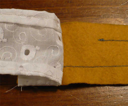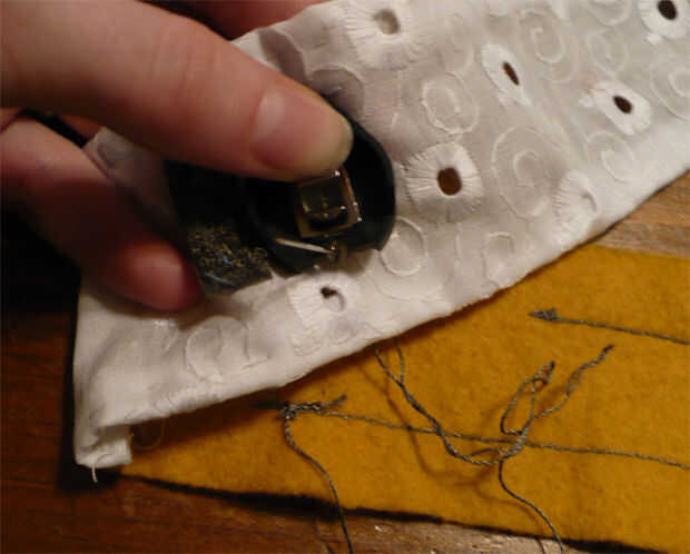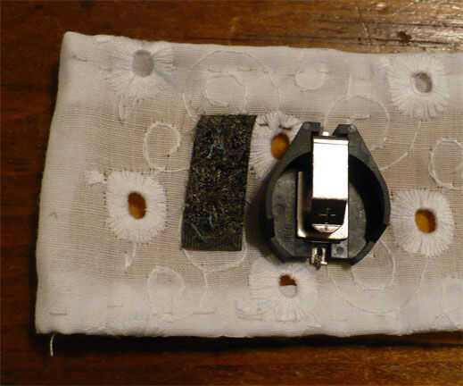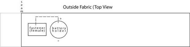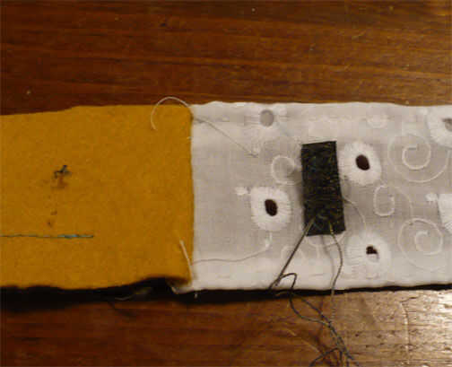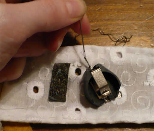 Una vez que se aseguran el soporte de la batería y el sujetador, tapa el fieltro para que sea bajo la tela. Luego tomar el hilo extra conductora que lo dejó en el fieltro y enhebrarla en una aguja, tirando de él a través de la tela superior y el orificio inferior batería titular. Asegúrese de recorrer un par de veces de ambas capas de tejido para garantizar al titular.