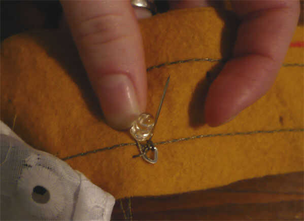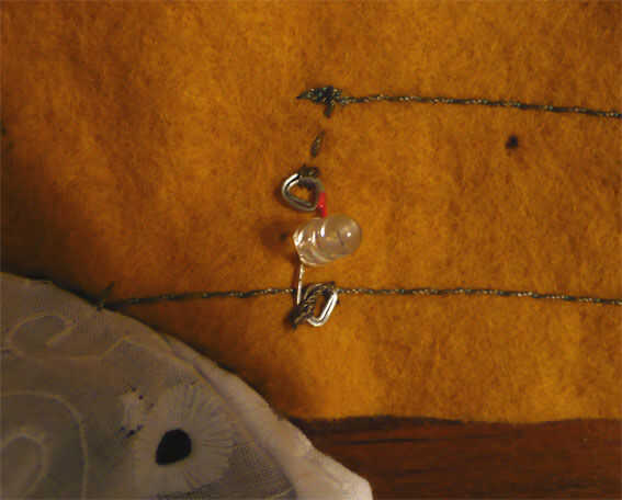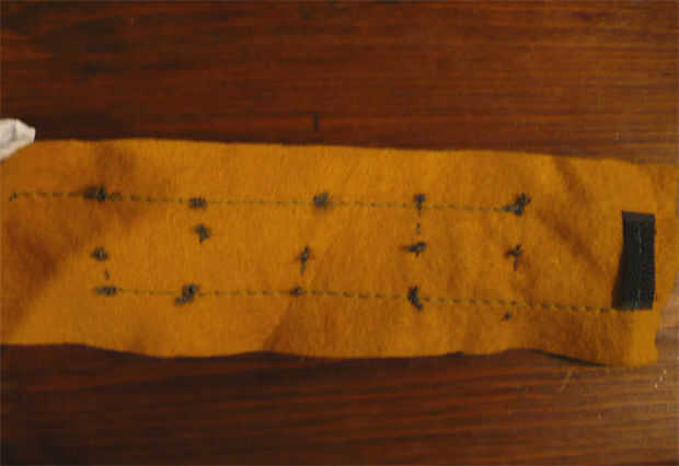 Cuando haya terminado de coser, utilizar sus tijeras para cortar los agujeros para los LEDs empujar a través de la tela (elegimos la tela con ojales para el trabajo ya estaba hecho). Una vez que los LEDs se colocan a su gusto, poner la batería en el soporte de la batería, conecte los sujetadores y probarlo! Si todo está bien, coser a la tela a la tela de fondo.