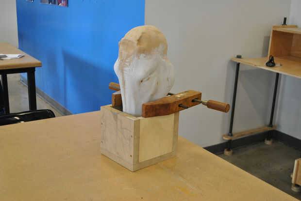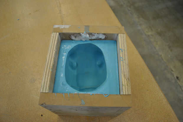 Para crear un molde negativo decente y estable del hocico, ambas mitades tienen que ser afianzado con abrazadera juntas y suspendido sobre el molde.  Hice una caja de madera, sólo ligeramente más grande que el hocico, para contener el material del molde, en este caso, Smooth-on OOMOO 25, un caucho de silicón de dos piezas compuesto de rigidez media.  Será lo suficientemente suave como para permitir la liberación de la pieza original, pero lo suficientemente dura como para mantener su forma con la ayuda de la caja.