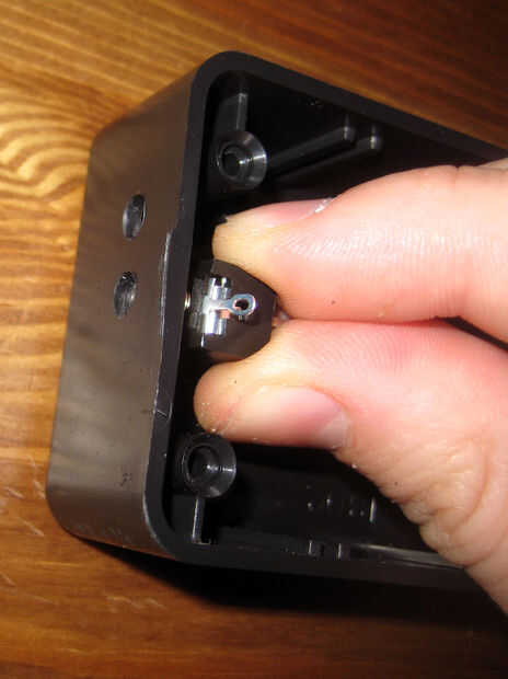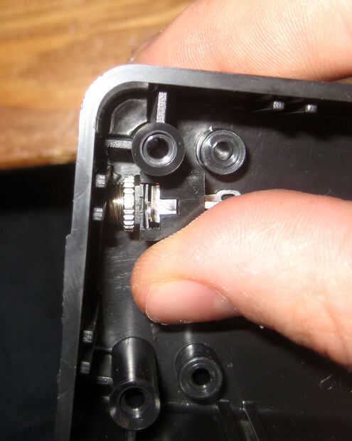 Luego voltear la caja y marque dos puntos en el otro extremo de la caja para los dos audífonos. Asegúrese de que las tomas sin obstrucciones dentro de la caja y que deje suficiente espacio entre los orificios para los conectores para ajustarse cómodamente al lado de uno. Los jacks de 1/8" que encajan perfectamente a través de un orificio de 1/4".