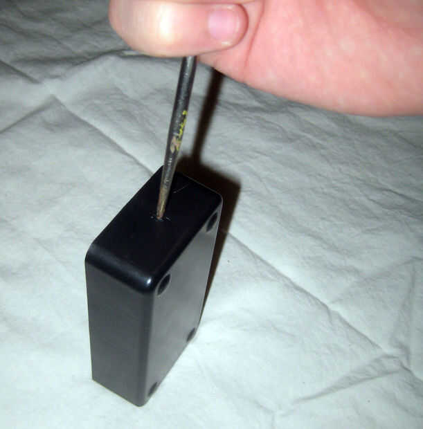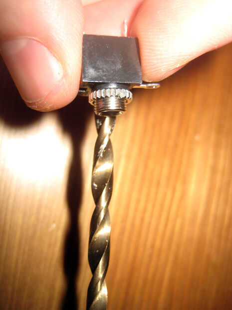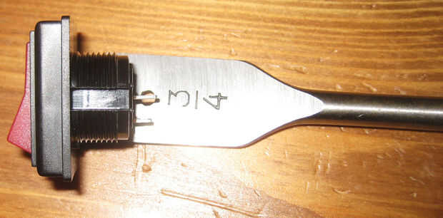 En primer lugar encontrar el centro de un extremo y marcar con un punzón. Utilice una pala de 3/4 broca para taladrar un agujero para el interruptor de alimentación (bueno, si usas el mismo switch que tengo... Si usas un switch diferente uso una broca de tamaño adecuado). Medición tenga en cuenta que tienes que dejar espacio para la tuerca que sujeta el interruptor al lado del caso... Si no tendrás un oso de un tiempo de ajuste hacia abajo de la tuerca y tratando de conseguir el interruptor correctamente asentado.