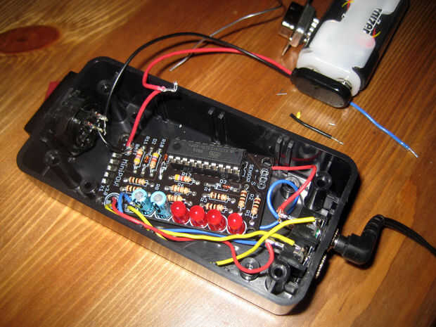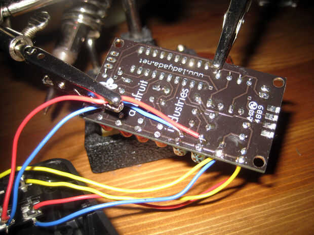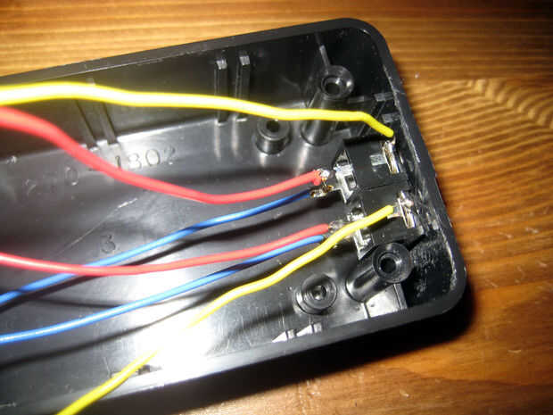 La soldadura de los dos canales para uno de los conectores de los electrodos ánodo para LEDs 1 y 2 (este conector será para sus gafas) y los dos canales para la otra toma a las almohadillas de ánodo de LED 3 y 4. Tendrán que compartir estos cojines con sus condensadores de 1μF. Este conector será para los auriculares. La soldadura de los cables de tierra de ambos conectores de los electrodos de cátodo para LEDs 1 y 2; todos los LEDs en la parte de MiniPOV un terreno común por lo que no importa donde van.
