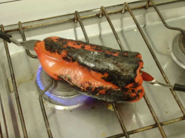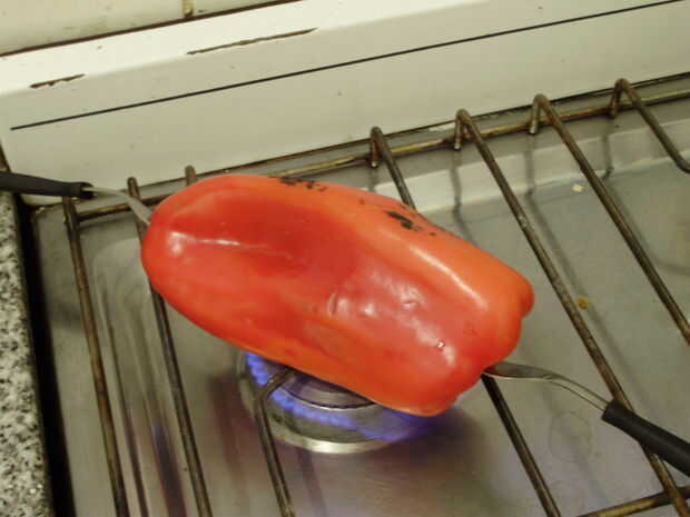 Tomar dos tenedores y péguelos en el pimiento, una a cada lado. Poner directamente en la estufa de gas de su cocina y ver que ennegrecer completamente. Utilice la horquilla para girar. Asegúrese de que el pimiento esté totalmente negro todo antes de decidirse a apagar el gas.