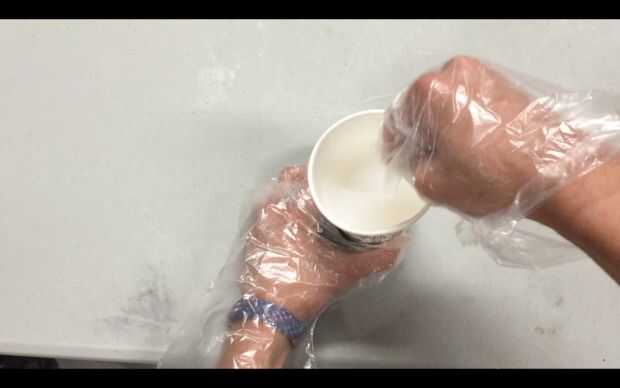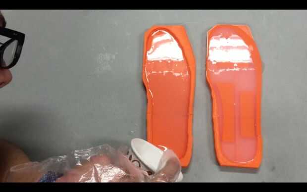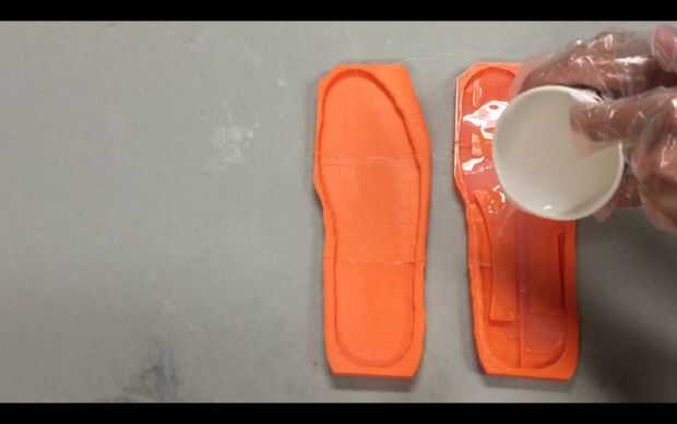 Mezclar una gran cantidad de Ecoflex 00 30 por recoger cantidades iguales (por volumen) en la taza y mezclar bien. Vierta el molde que tiene los canales de aire (uno con las formas funky) todo el camino hasta el borde y llenar el molde sólo hasta la mitad. Si Ud. no mezcla suficiente silicona, mezclar más. Dejar curar durante cuatro horas.