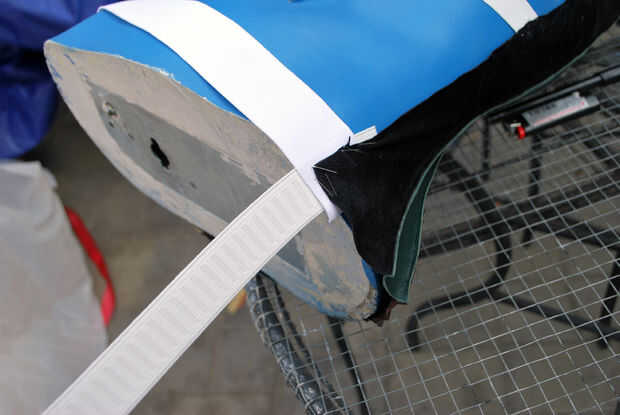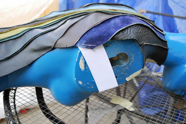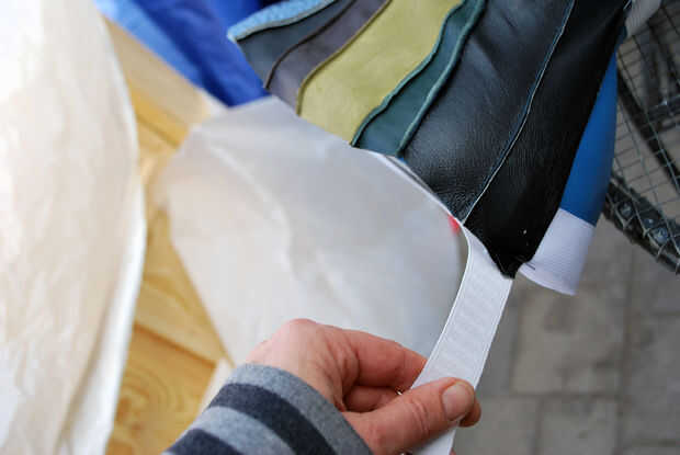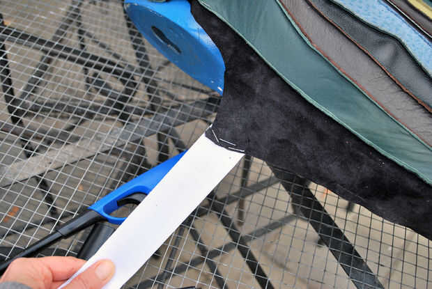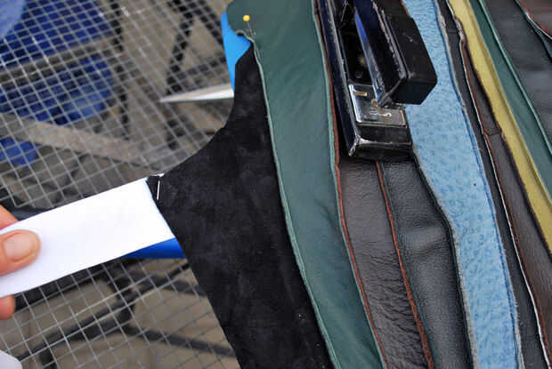 Esto ha añadido un montón de agujeros de grapa a esa esquina. Y cuando tiré el elástico a través del lado opuesto, el cuero comenzó a rasgar. Bueno, tal vez las grapas no eran mi mejor opción. Tiempo para sacar los pasadores de seguridad.