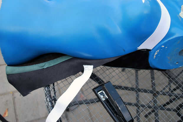 Para estirar el cuero muy bien sobre la espalda del maniquí, yo cumplire suave presión a cada lado para sujetarlo. Elástico fue una gran elección! Tuve un montón de pedacitos de sobra de un gig de la TV, así que tiró a la papelera y nos dispusimos a la plataforma de la piel. Había margen extra en las costuras laterales, hombros y bordes inferiores de la pieza trasera de cuero. Pensé que podía las piezas elásticas en los bordes de la grapa y uso el elástico para tirar de la parte posterior sobre la forma.