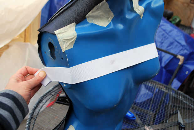 Comencé con la parte superior de la costura del lado izquierdo y sujetado con grapa un pedazo de elástico en el borde. He configurado al maniquí en su base y tiró el elástico a través y sobre su busto a la costura del lado opuesto. Entonces yo con grapas al final del elástico en la parte superior de la costura lateral derecha trasera. Era un poco torpe empujar la grapadora en la piel, pero funcionaba bien.