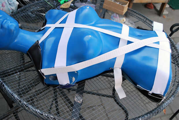 El siguiente paso fue averiguar donde el elástico para maximizar la suavidad y minimizar las áreas con los agujeros de perno del perno. Una pieza de elástico pasó de la derecha fuera de hombro y cubrió a vuelta alrededor al lado izquierdo de la parte inferior. Fue otra pieza del interior hombro a la derecha y en frente del maniquí a la costura del lado izquierdo. Comprobé después fijando cada pieza de elástico para asegurarse de que la parte trasera lisa. Todavía era un poco pandeo en las costuras laterales, pero la mayoría del cuero encaja perfectamente en la parte posterior y no quería que ningún agujeros de perno más de la necesaria.