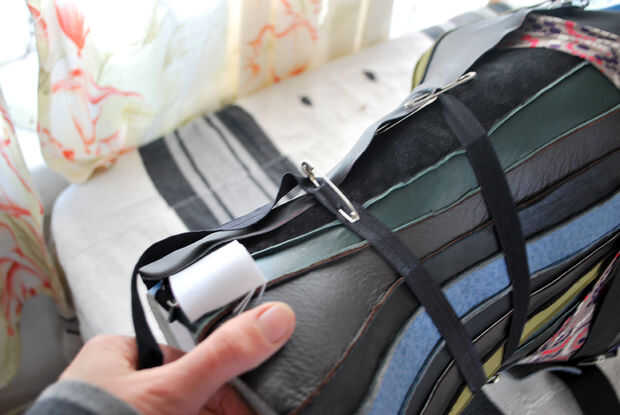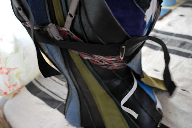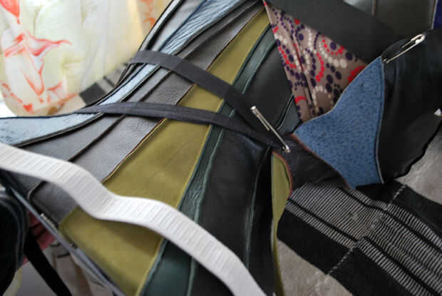 Coloca la pieza delantera de cuero de Kali sobre el maniquí y luego se tira el cubo de chatarra elástico y pernos de seguridad. Cubrió una pieza más ancha de elástico a la costura del lado izquierdo, justo en la axila. Puse al maniquí vertical, tiró del elástico a través a la axila opuesta y cubrió bien.