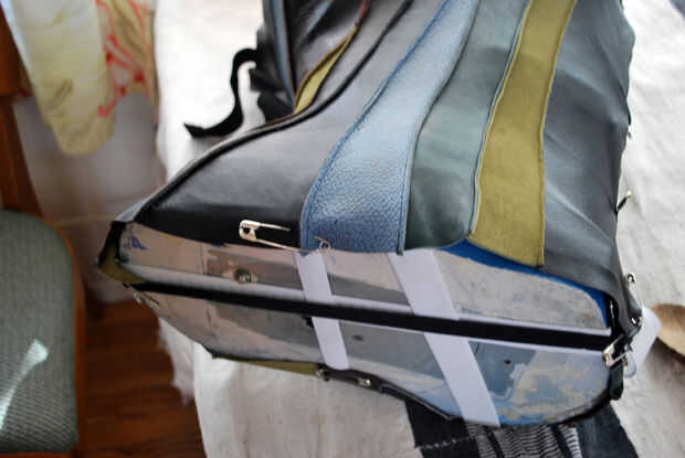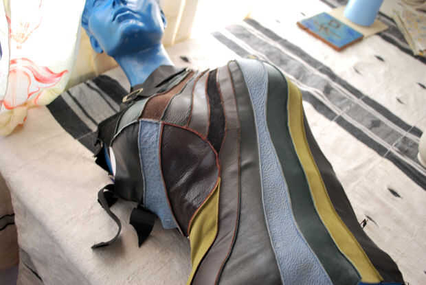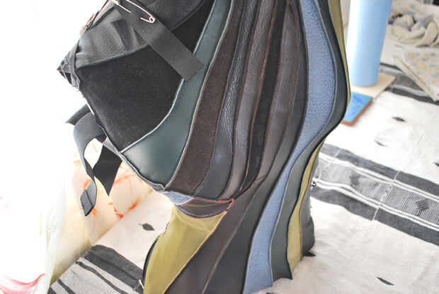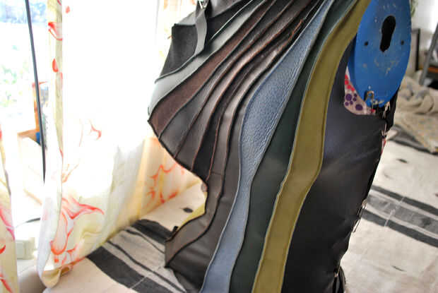 Puse al maniquí en su espalda y vieron las arrugas para ver dónde colocar el elástico. He probado esto tirando la piel hacia abajo en los puntos de costura diferentes. Cuando tiró en la costura que une el cuero nubbly azul al pantalón negro de cuero, las arrugas alisaron. Cubrió el elástico en la parte inferior de la costura, luego cubrió el elástico a través a la parte posterior de la base del formulario. Configurar el formulario de nuevo para comprobar hacia fuera.