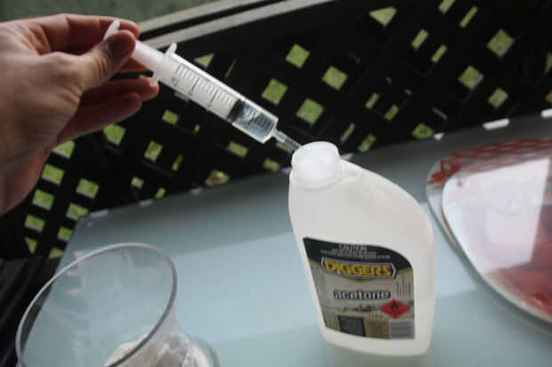 Usar una jeringa entera de acetona por carrera y parece que funciona bastante bien, no dude en cambiar las cantidades a satisfacer.